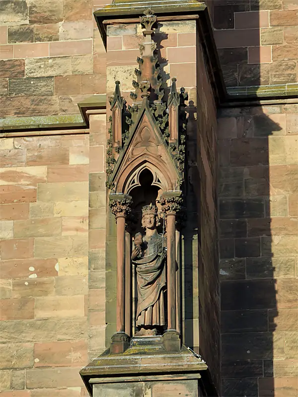 Kunsthistoriker bezeichnen den Maßwerksturmhelm als einen der schönsten Kirchtürme. Baumaterial war Sandstein vom Lorettoberg im Südwesten der Stadt.