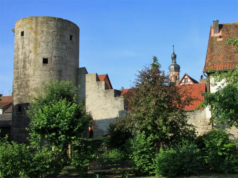 In Eibelstadt gibt es eine vollständig erhaltene Stadtmauer. Sie hat 14 Türme. Das Maintor ist aus den Jahren 15010-1520 und der Kereturm aus dem Jahr 1573.