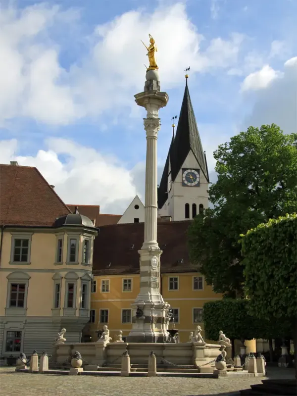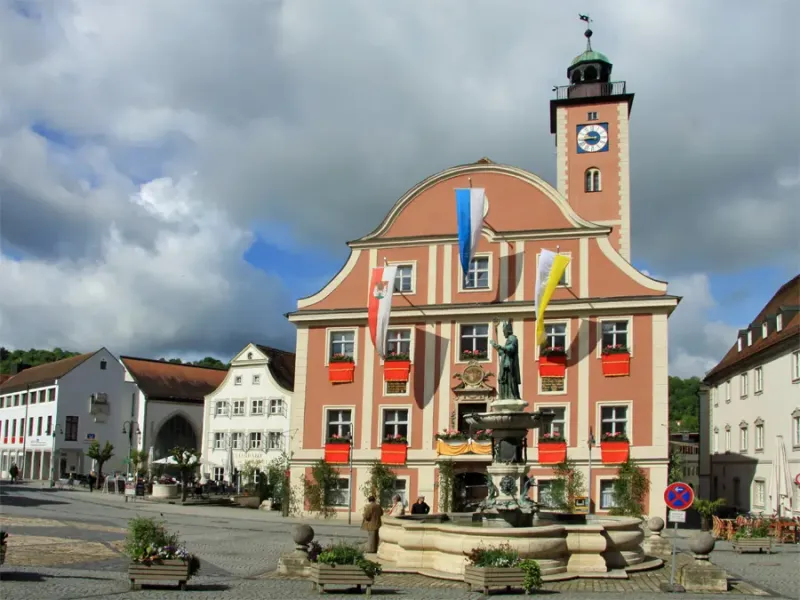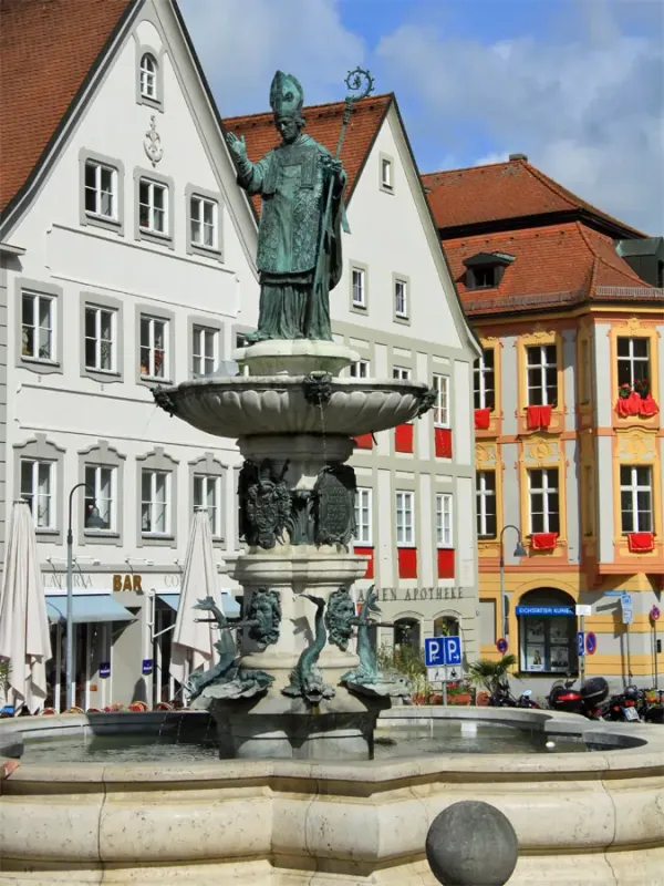 - Marktplatz mit Willibaldsbrunnen und dem Rathaus