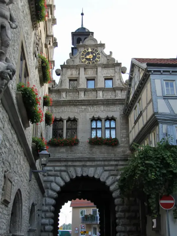 - Renaissance-Rathaus, erbaut 1579–1581 mit angeschlossenem Stadttor