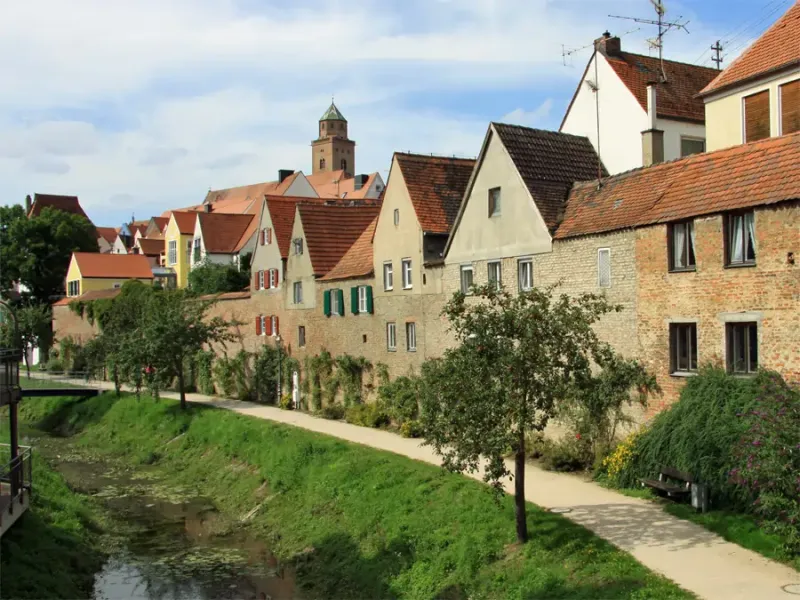 Große Kreisstadt Donauwörth ist das Zentrum vom schwäbischen Donau-Ries-Kreis in Bayern und liegt am Südhang der Fränkischen Alb. Südlich von Donauwörth fließt die Donau von Südwest nach Ost. Im Stadtgebiet mündet der nördliche Nebenfluss, die Wörnitz, in die Donau sowie die Zusam und Schmotter von Süden kommend. 12km östlich von Donauwörh befindet sich die Mündung des Lech. Südlich von der Stadt beginnt der Naturpark Augsburg- Westliche Wälder.