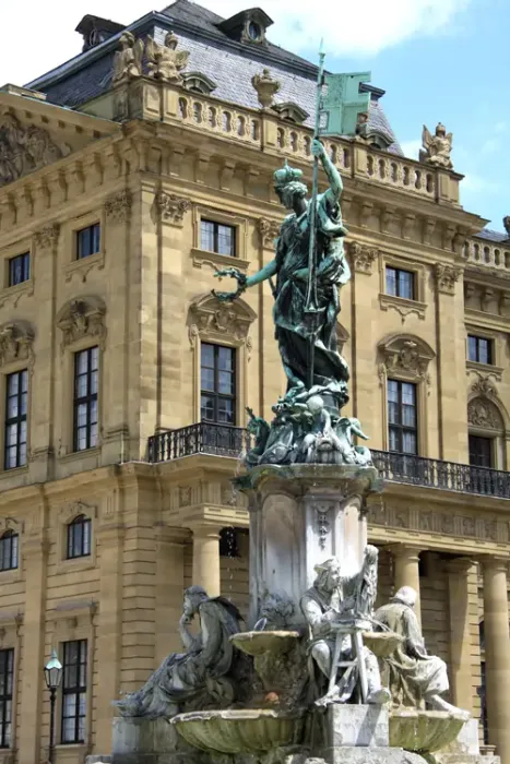 Vor der Residenz wurde auf dem Residenzplatz der Frankoniabrunnen im Jahr 1894 aufgestellt. Der Brunnen im Stil des Neobarock war ein Geschenk an den Prinzregenten Luitpold von Bayern. Die Hauptfiguren unter der „Frankonia“ stellen Tilman Riemenschneider, Walther von der Vogelweide und Matthias Grünewald dar.