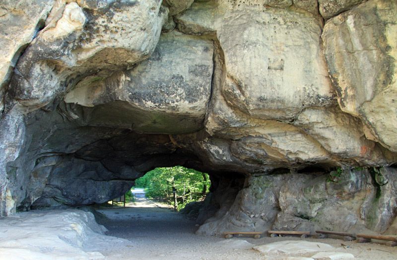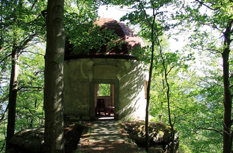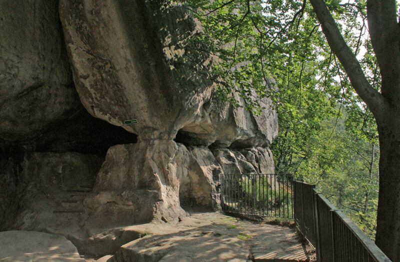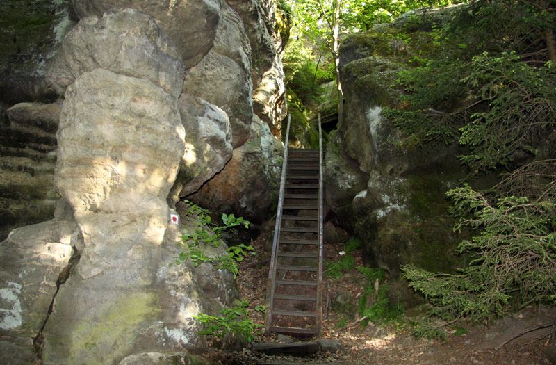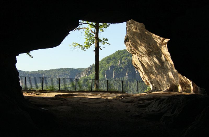 Über die Treppen östlich der Höhle erfolgt der Abstieg. Nun geht es durch ein großes Waldgebiet auf dem Fremdenweg ohne große Steigungen nach Süden. Nach ca. 1,5 km wird am Wettinplatz die Zeughausstraße und nach 500 m der Königsweg überquert. Es beginnt der Aufstieg auf den Kleinen Winterberg. Anschließend gibt es die Möglichkeit rechts auf dem Affensteinweg weiter zu wandern und links dem Fremdenweg zu folgen. Ca. 100m nach links ist der Aufstieg auf den Kleinen Winterberg zum Pavillion.